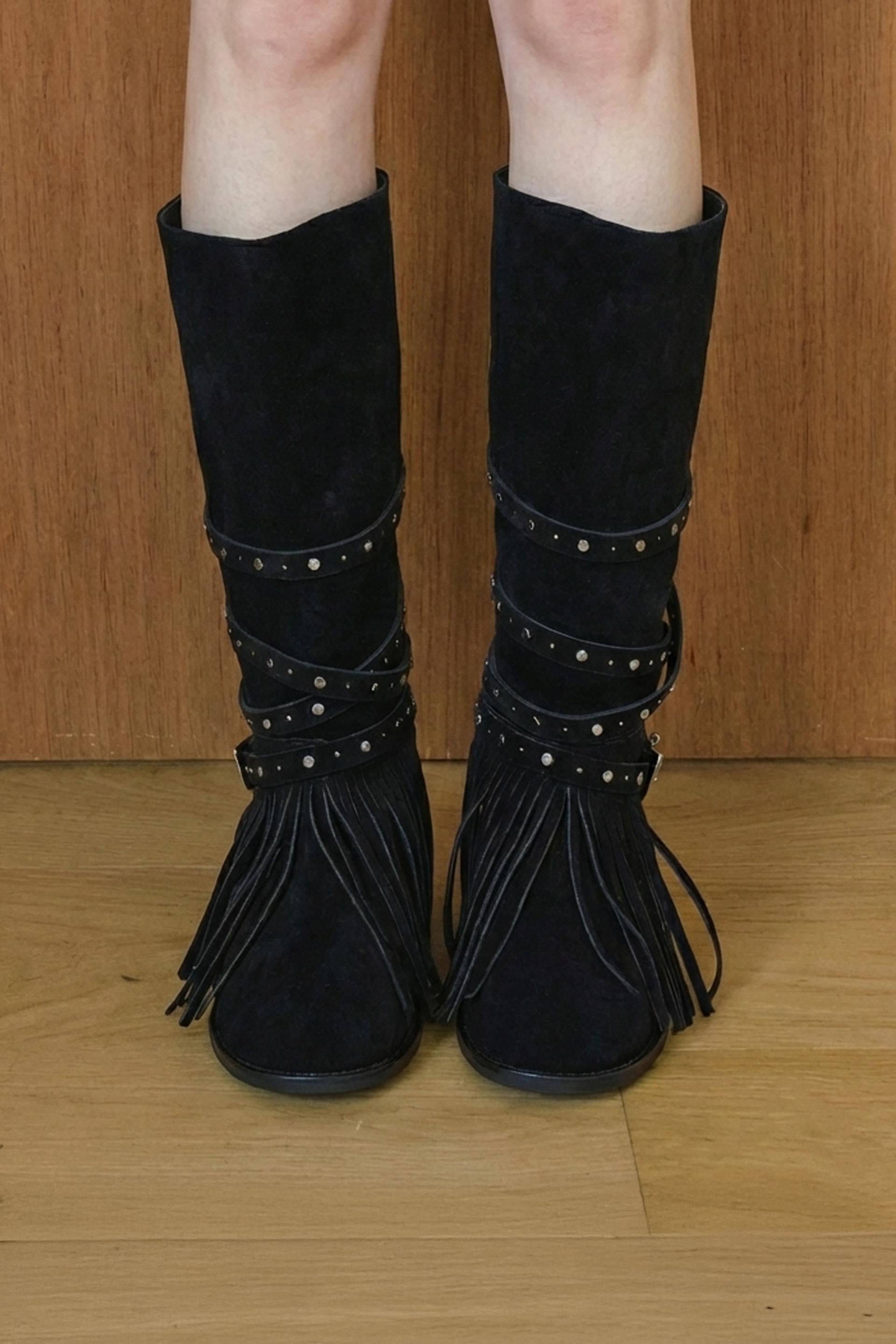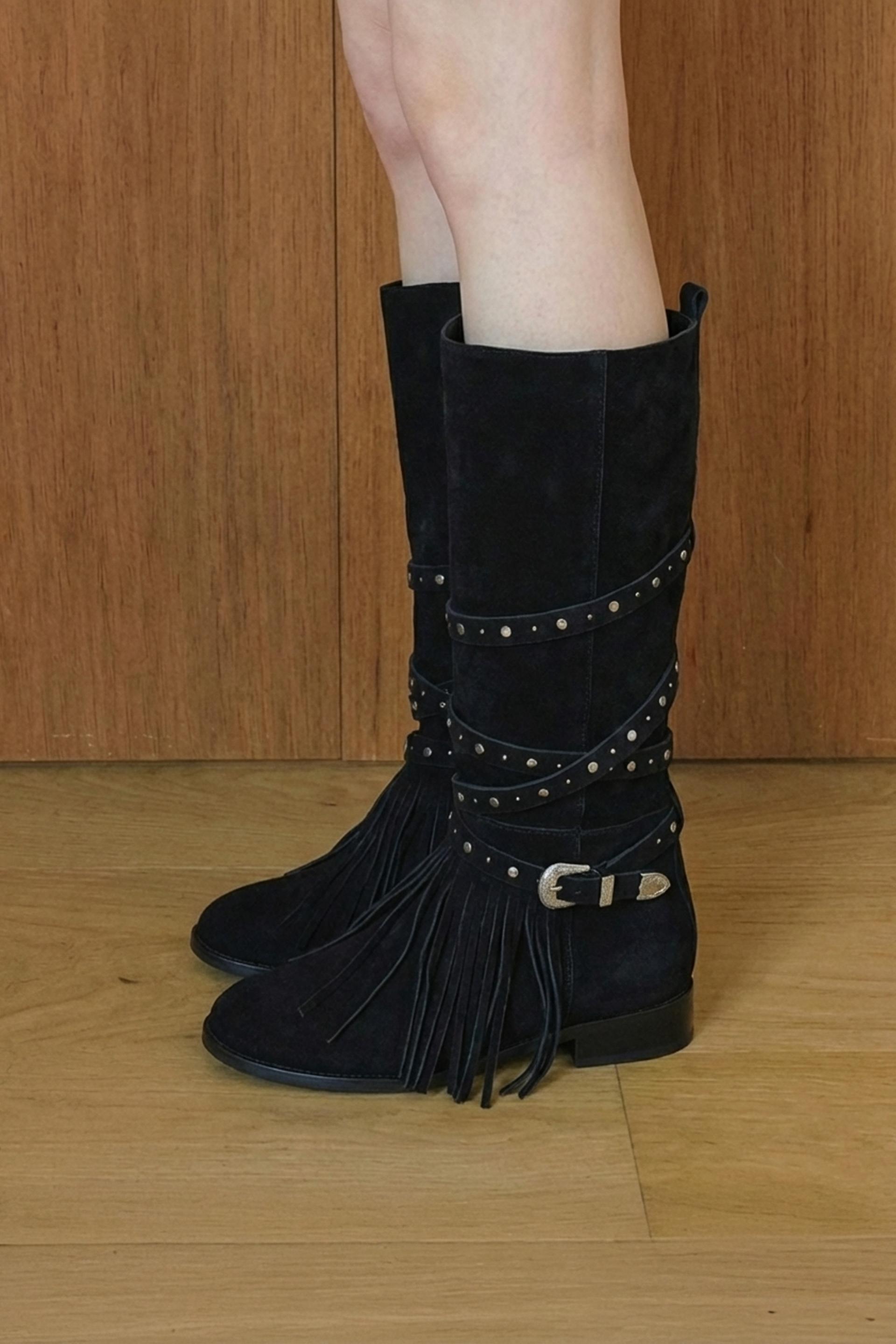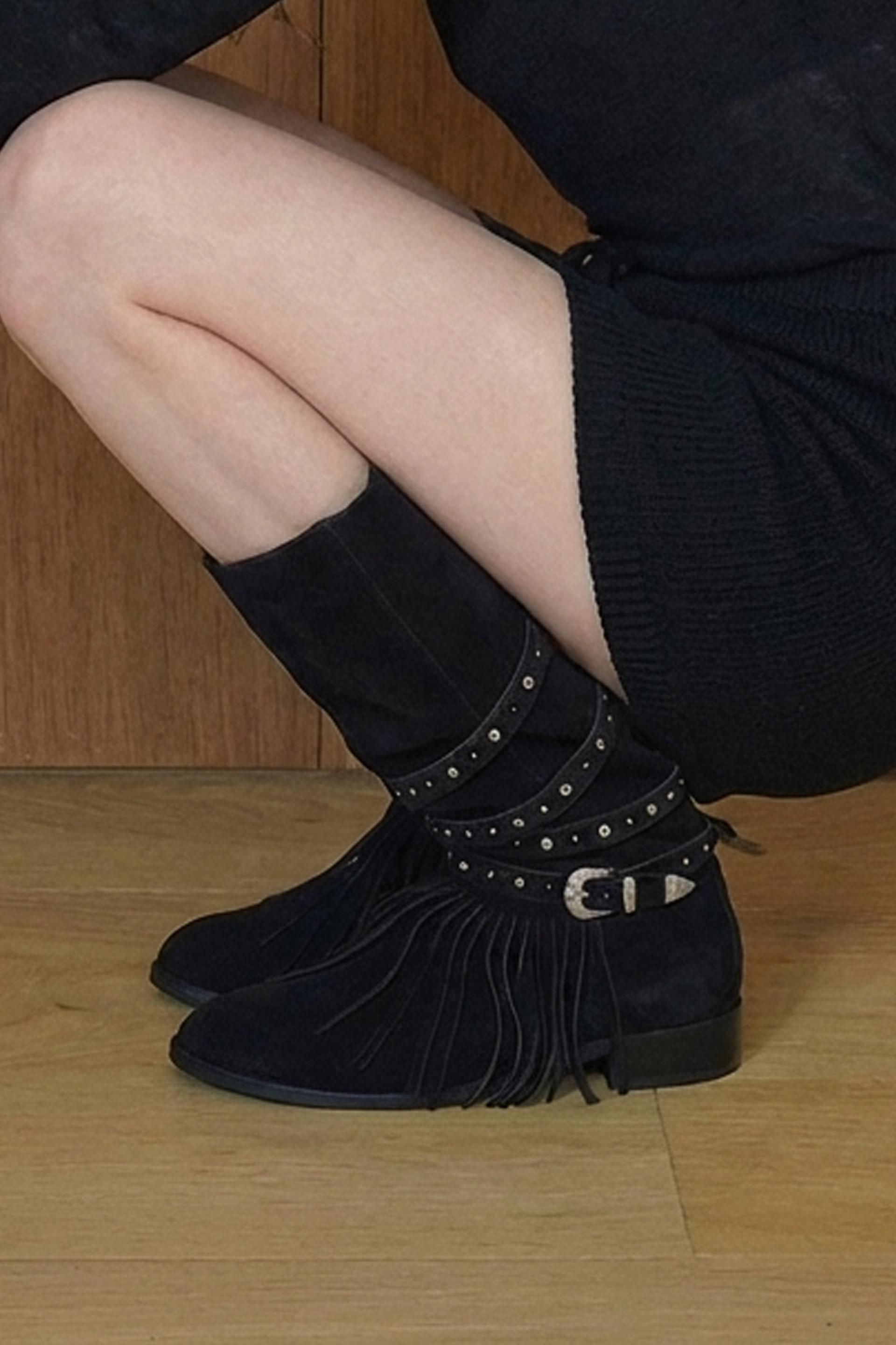 ARBOR 591은 보헤미안 분위기를 완성하는 프린지 디테일을 더하고, 부츠 전체를 감싸 흐르는 스트랩과 웨스턴 버클 장식이 자연스럽게 조화를 이룹니다.