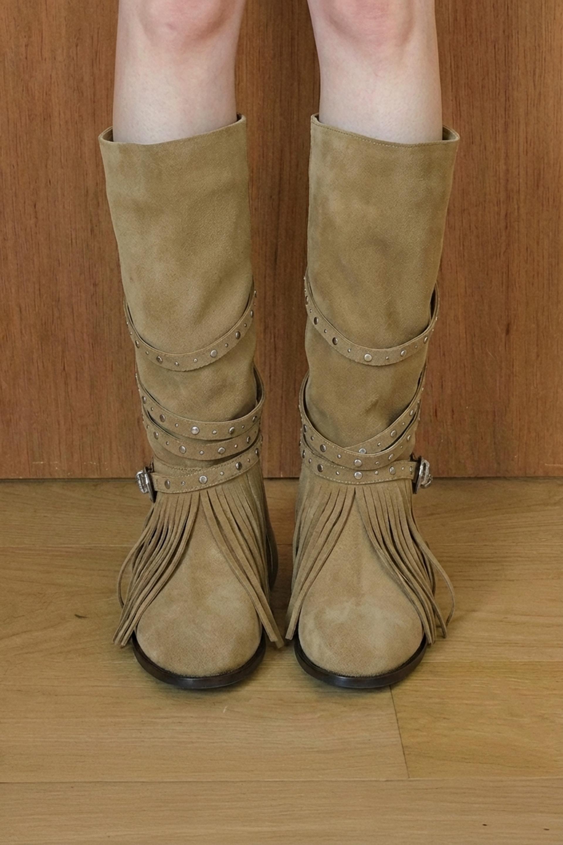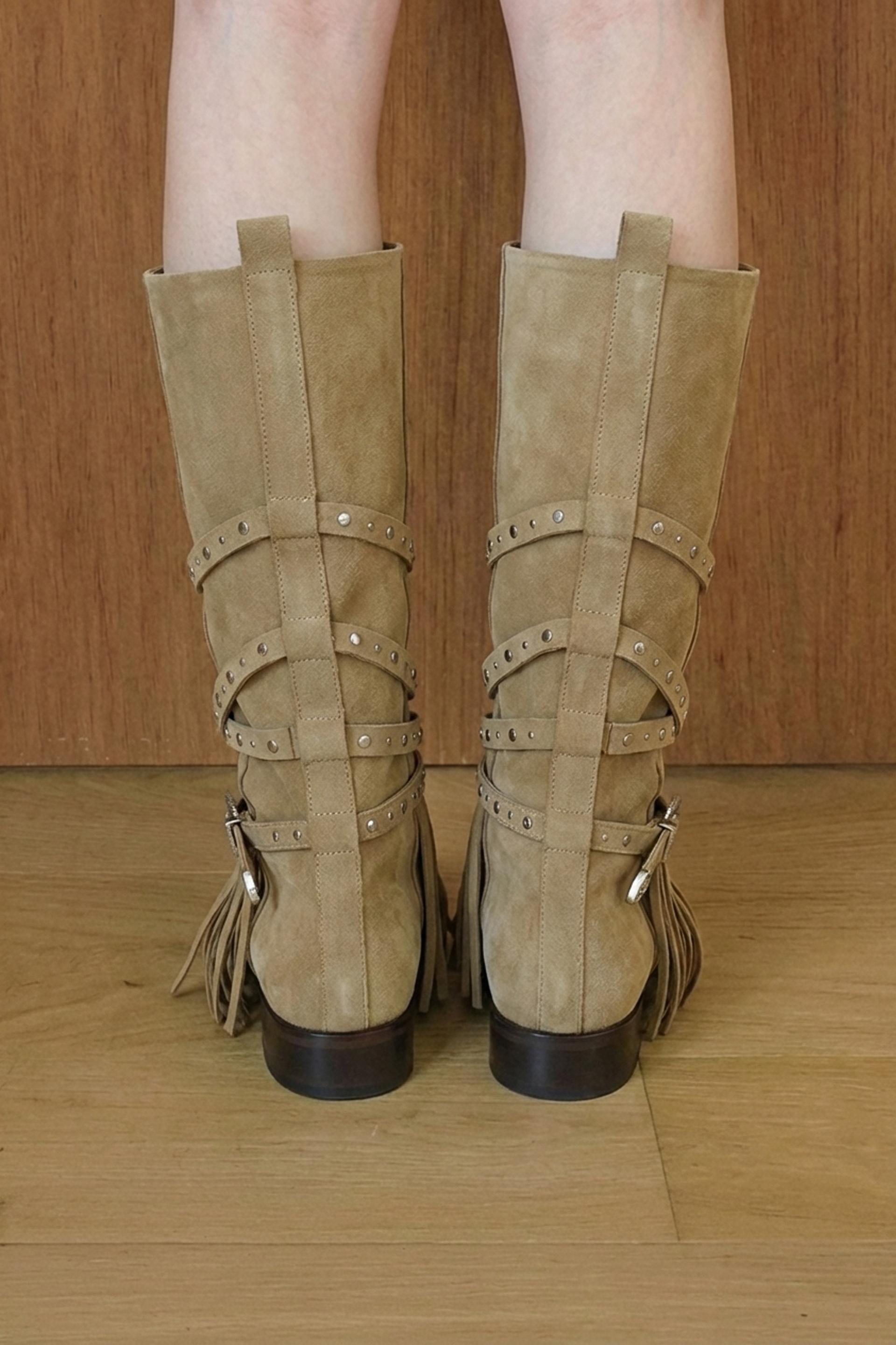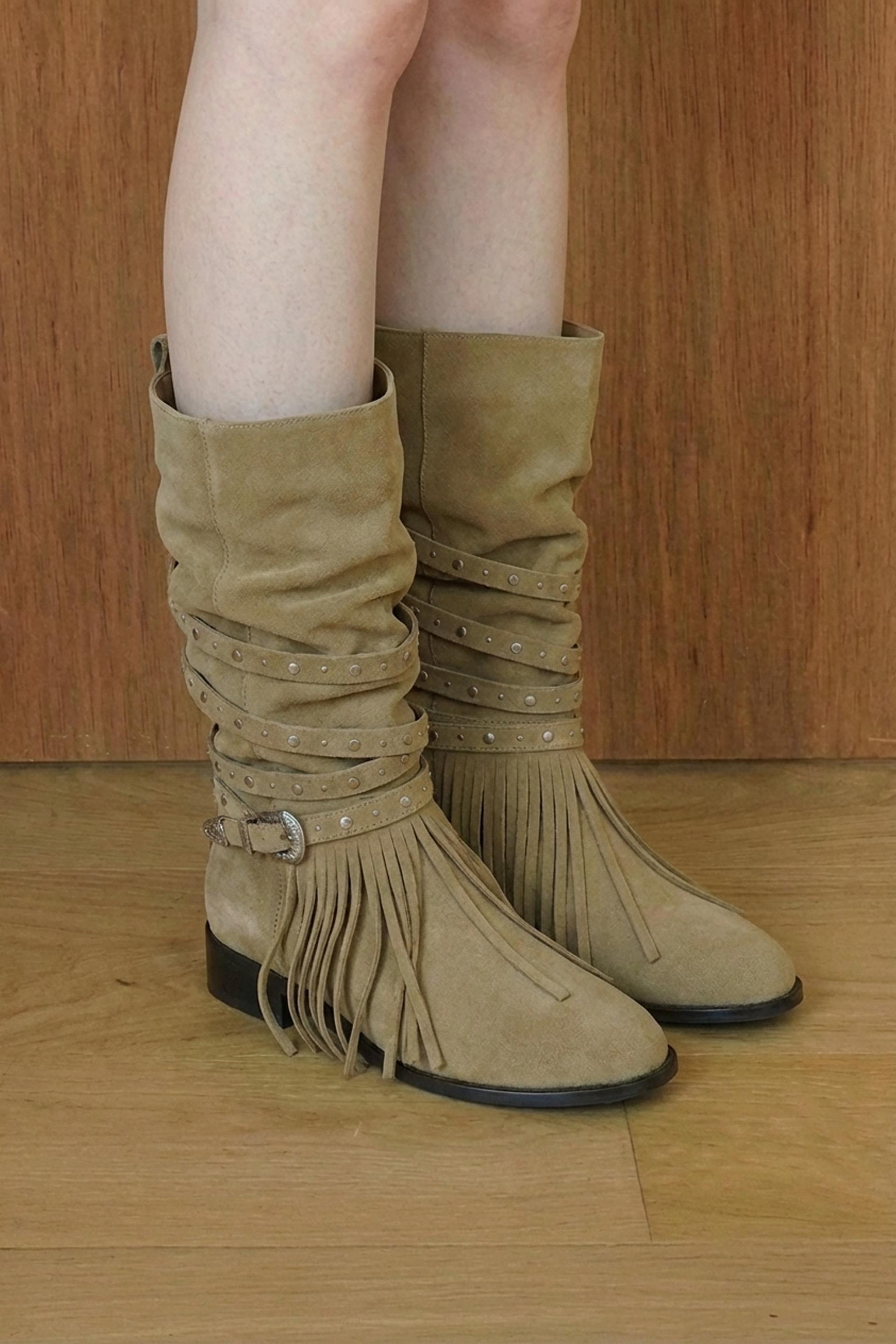 ARBOR 591은 보헤미안 분위기를 완성하는 프린지 디테일을 더하고, 부츠 전체를 감싸 흐르는 스트랩과 웨스턴 버클 장식이 자연스럽게 조화를 이룹니다.