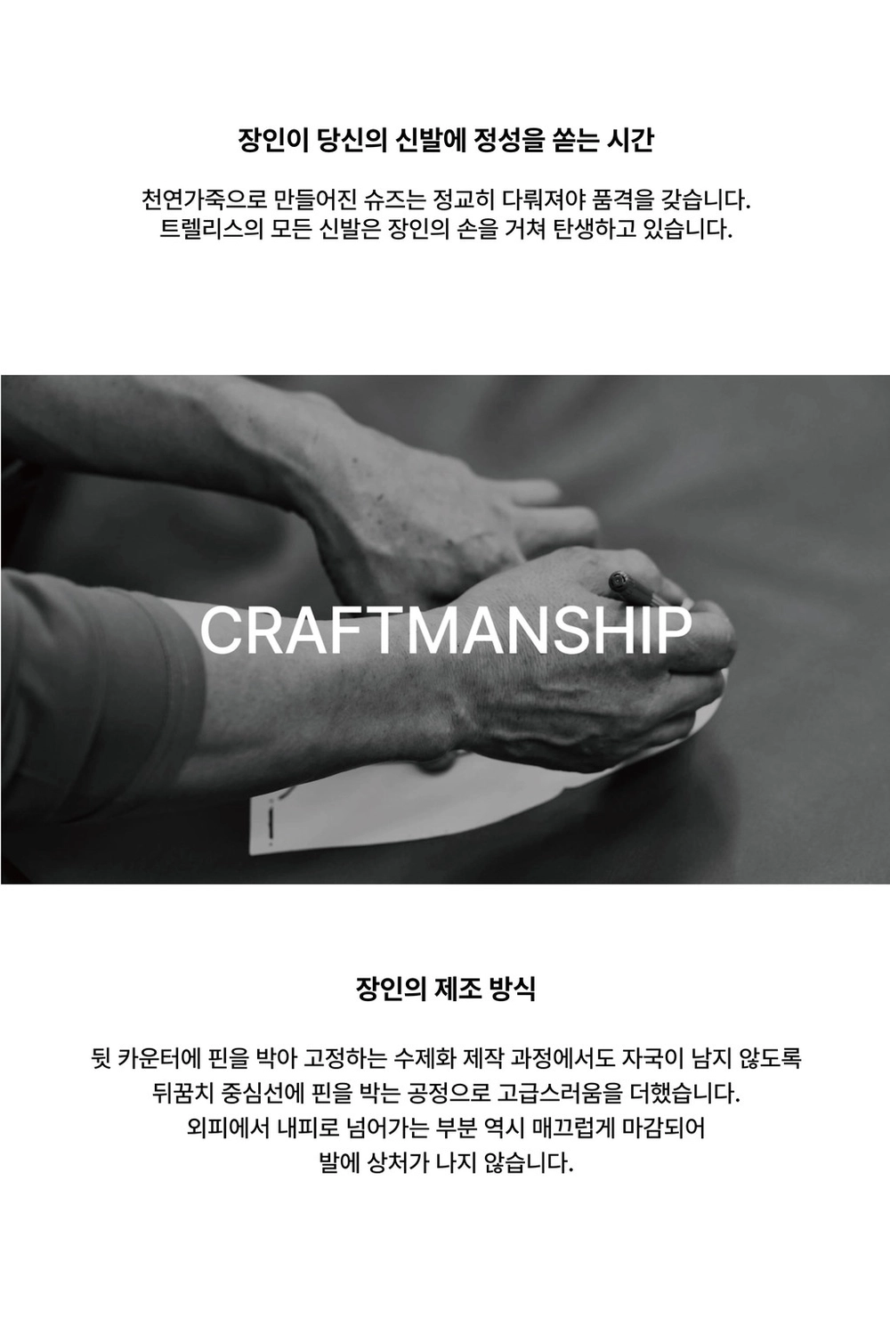 1. 천연가죽을 사용하여 제작하므로 착화 시 물기와 구두 불광 또는 독한 구두약품의 사용을 반드시 피해 주시기 바랍니다.