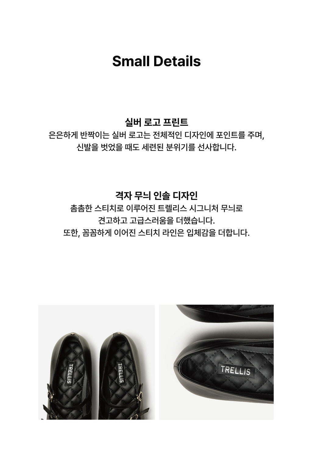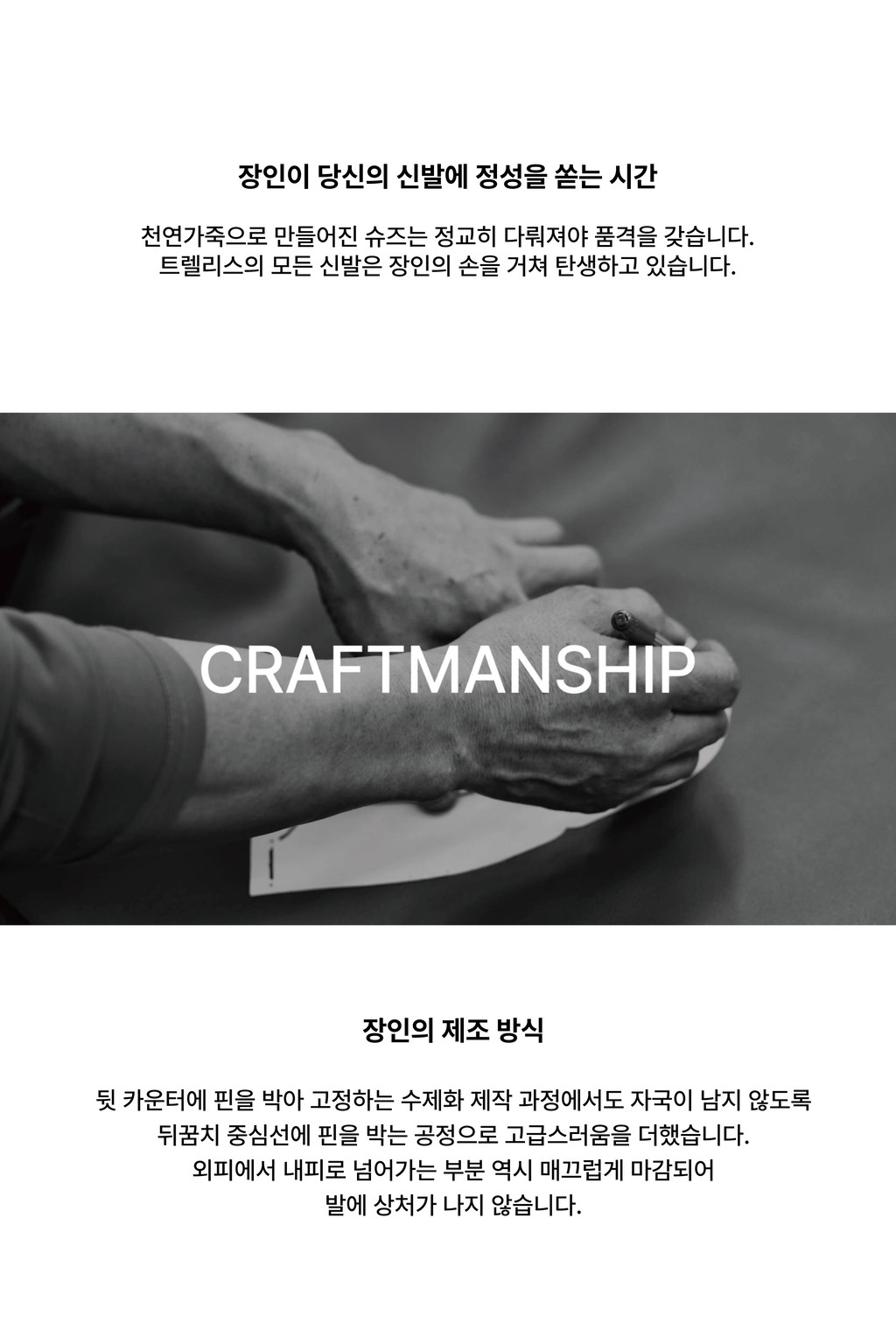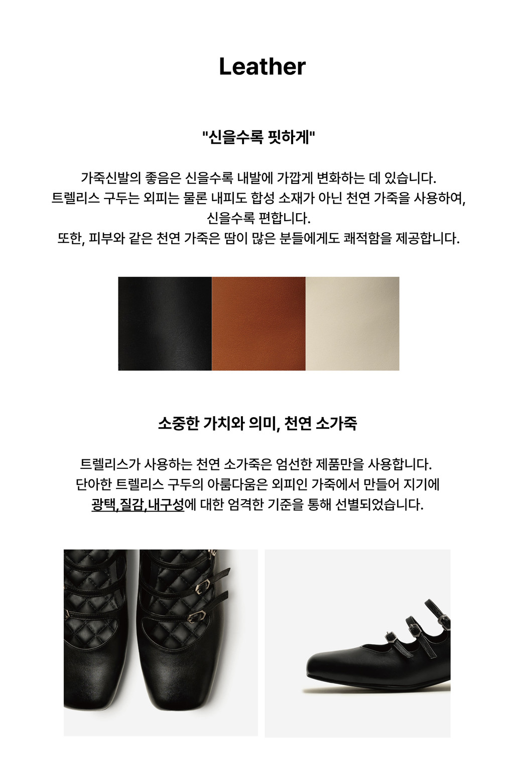 1. 천연가죽을 사용하여 제작하므로 착화 시 물기와 구두 불광 또는 독한 구두약품의 사용을 반드시 피해 주시기 바랍니다.