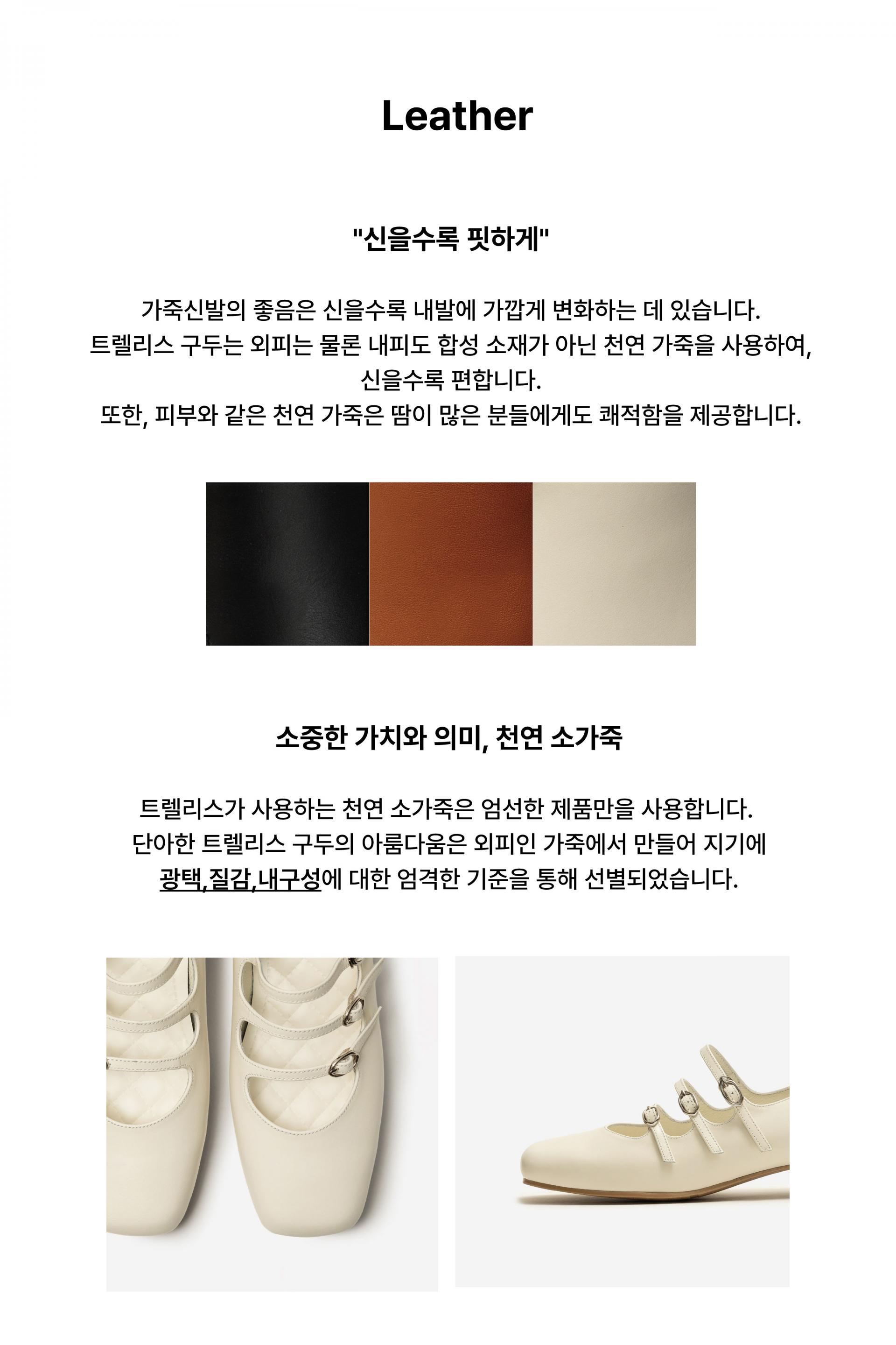 1. 천연가죽을 사용하여 제작하므로 착화 시 물기와 구두 불광 또는 독한 구두약품의 사용을 반드시 피해 주시기 바랍니다.